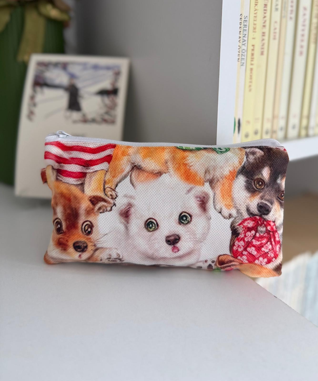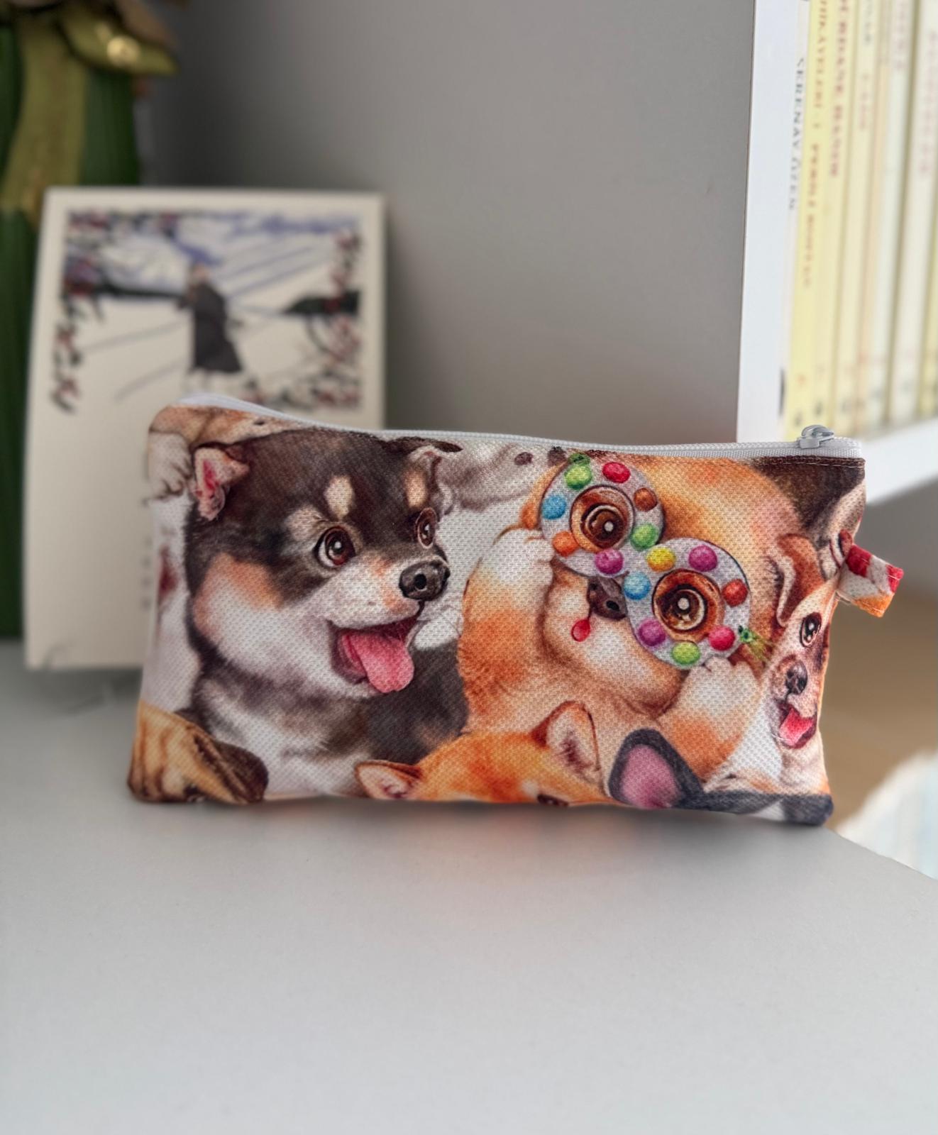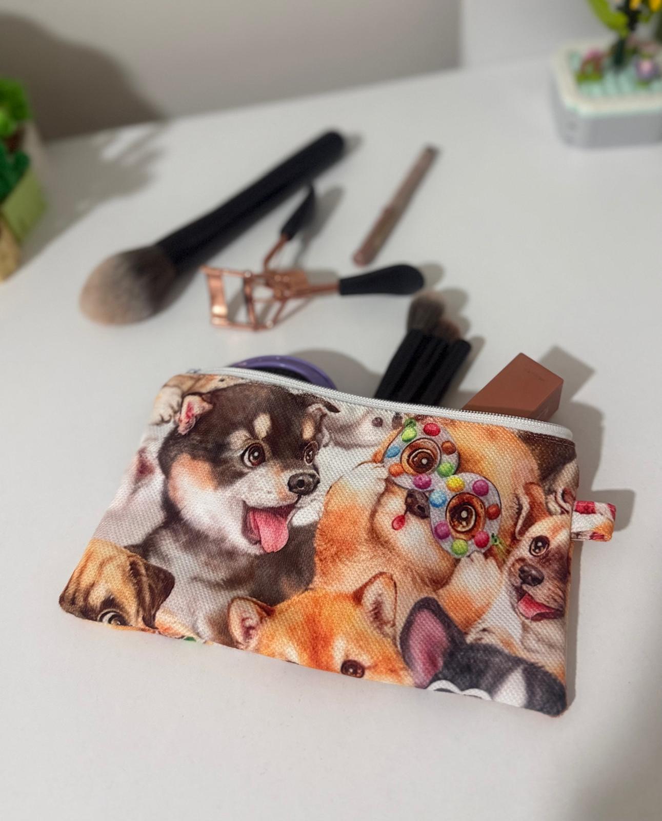 Dijital Baskılı Köpek Desenli Fermuarlı Astarlı Makyaj Çantası ölçüleri 18-10 cm dir.